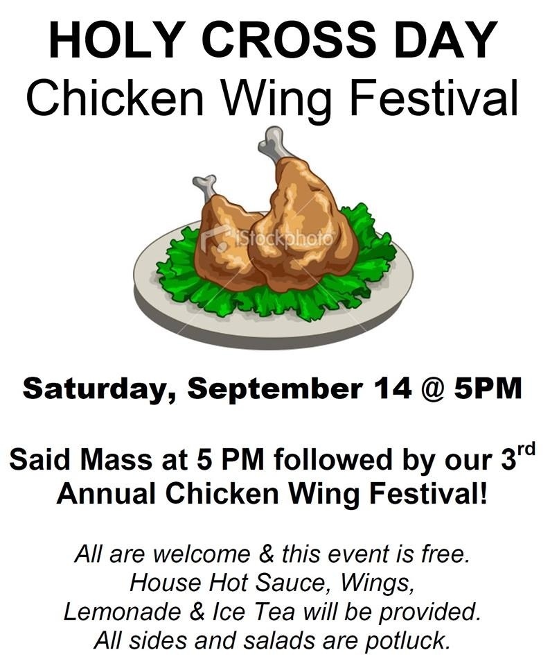 Tonight : Holy Cross Day & Chicken Wing FestivalBy admin / September 14, 2013 We have several hundred wings, hot sauce, blue cheese and ranch dips, and lemonade! Bring other sides, grillables to share, desserts, drinks, etc. Mass at 5pm for Holy Cross Day Chicken Wing Festival at 5:30pm