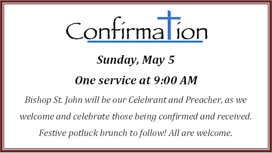 Reminder: one service today at 9:00 am!By admin / May 5, 2019 Good morning, good people. Remember we have one service this morning at 9 am with confirmation and receptions, followed by a potluck brunch with Bishop St. John. See you there!